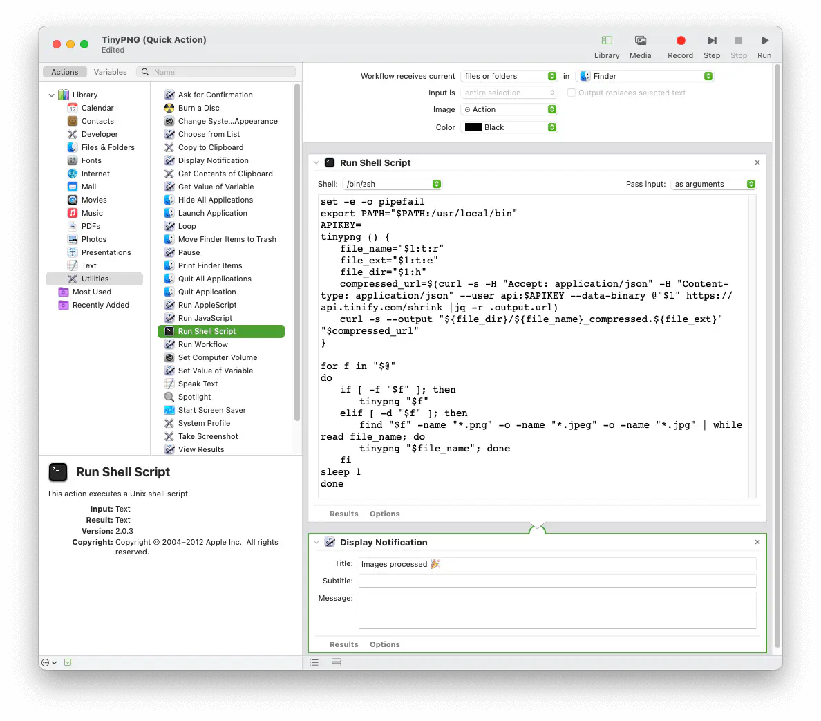 Put the following script into the Run Shell Script window, replacing the YOUR_API_KEY_HERE string with your API key obtained from TinyPNG.